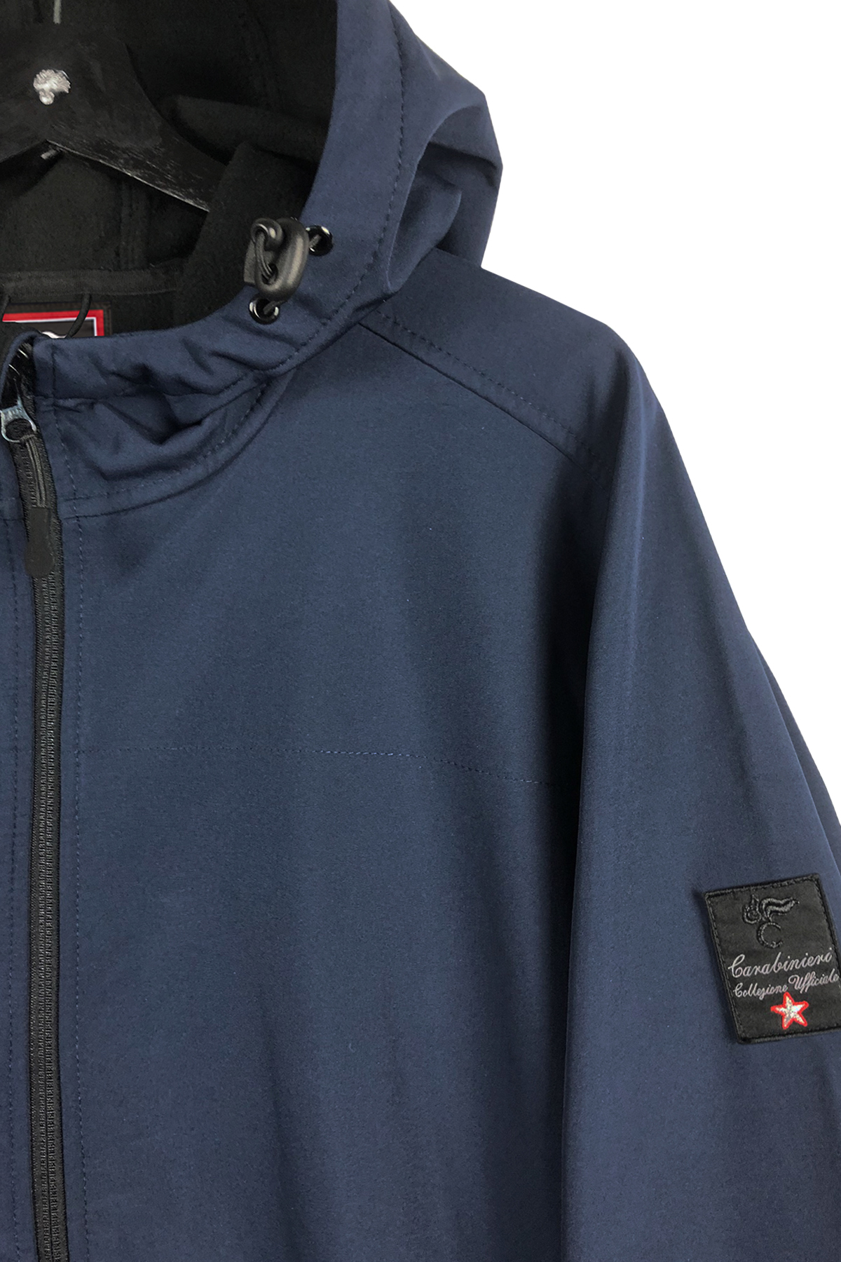 La nuova giacca blu con cappuccio firmata Carabinieri Collezione Ufficiale in soft shell, 2 tasche laterali e 1 tasca sul petto con zip Coulisse regolabile in vita Polsini regolabili con Velcro Cappuccio con coulisse e ferma cordini. 94% poliestere - 6% elastan Fodera in pile : 100% poliestere 3 strati Membrana 8000 mm impermeabile e traspirante
