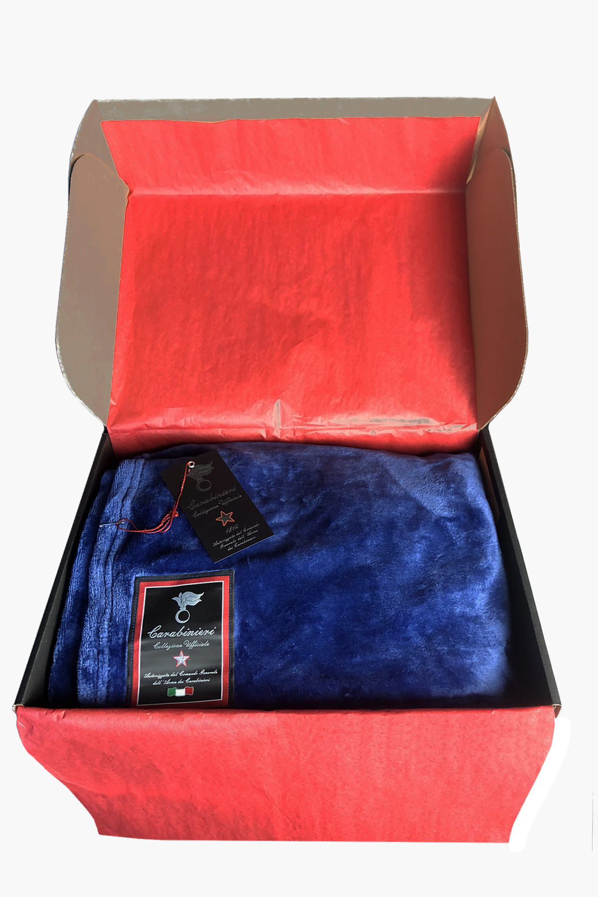 Idea regalo Carabinieri Collezione Ufficiale: GRANDE COPERTA 200X150 IN MORBIDO PILE COLOR ROYAL. CONFEZIONE REGALO IN SCATOLA NERA CON FIOCCO ROSSO.