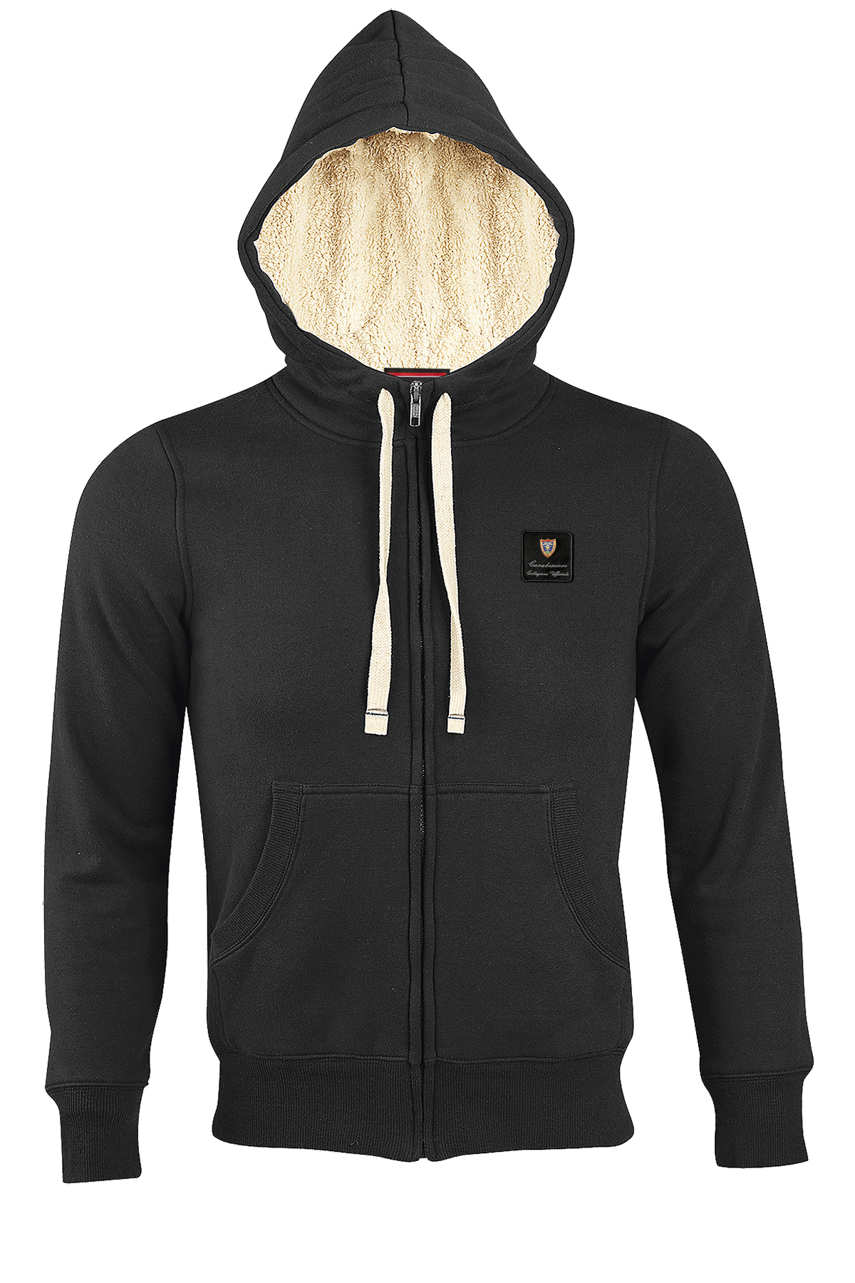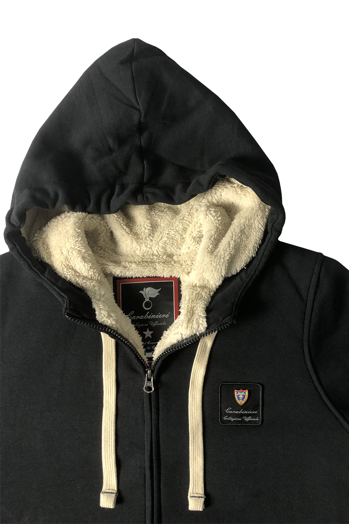 La nuova felpa nera con cappuccio, foderata pile orsetto, adatta al grande freddo. Esterno 80% cotone 20% poliestere, fodera 100% poliestere. Patch a cuore con distintivo di metallo FORESTALE.