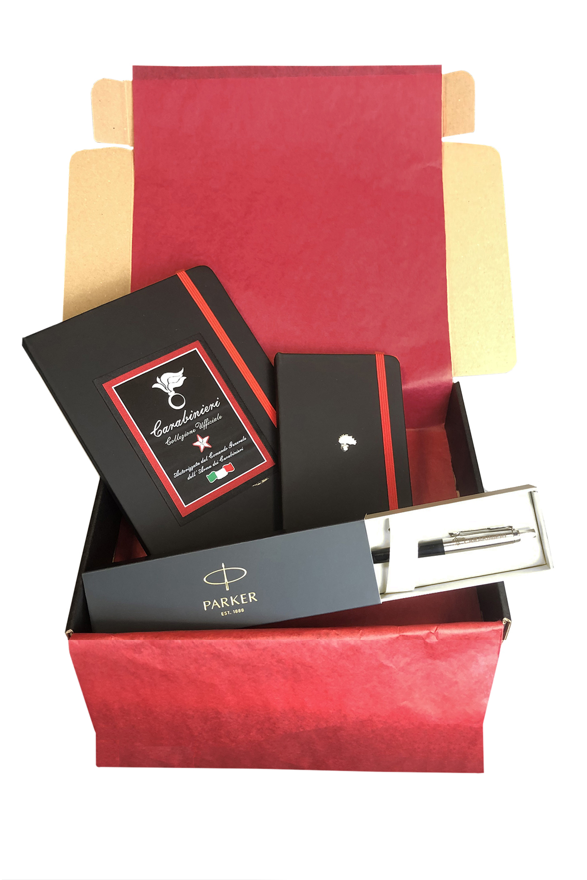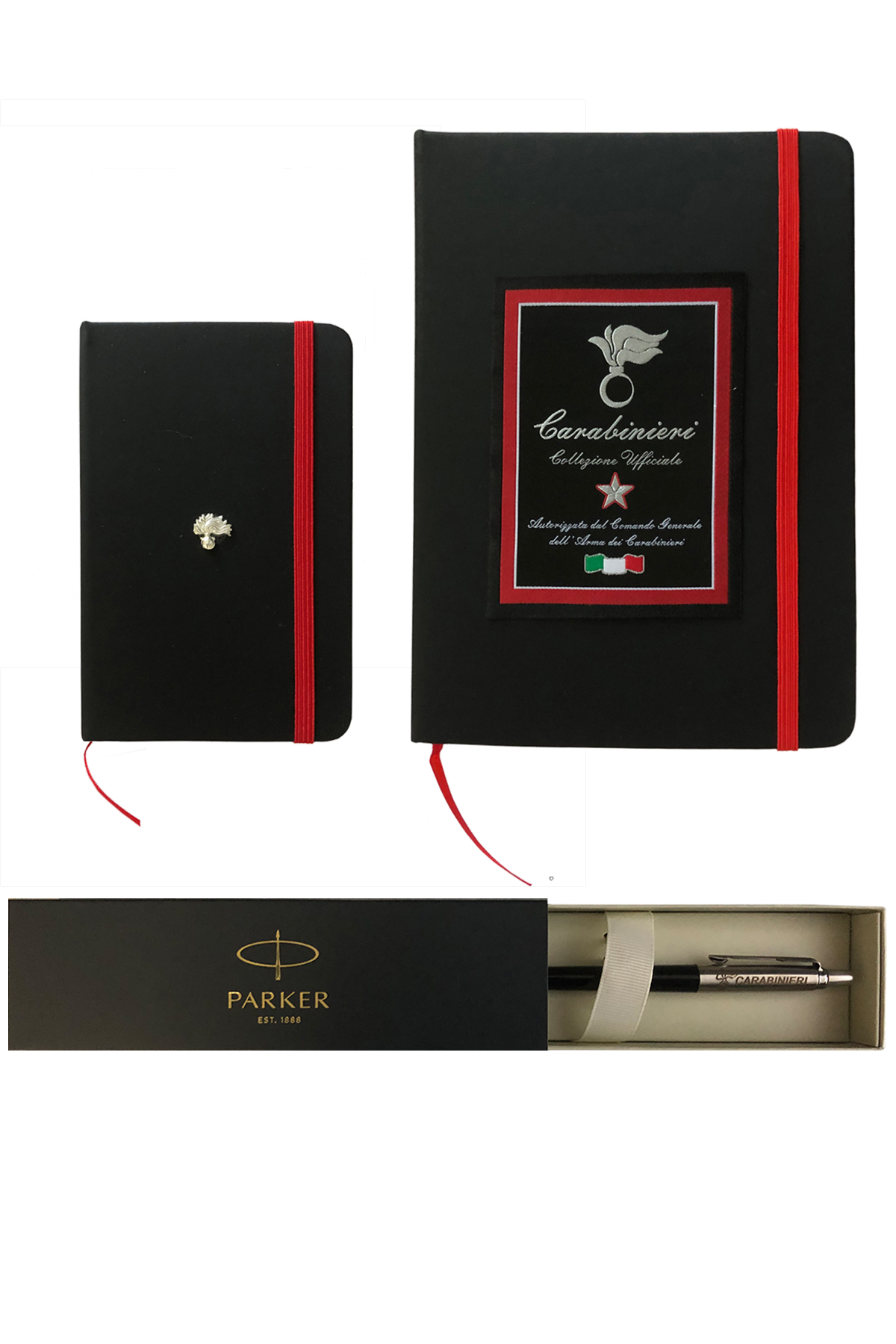 Idea regalo Carabinieri Collezione Ufficiale: 2 QUADERNI Formato 14x9,1 E FORMATO 21x14,6 - 80 fogli, CON Copertina nera E dettagli rossi. PENNA PARKER NERA CON LOGO CARABINIERI. CONFEZIONE REGALO IN SCATOLA NERA CON FIOCCO ROSSO.