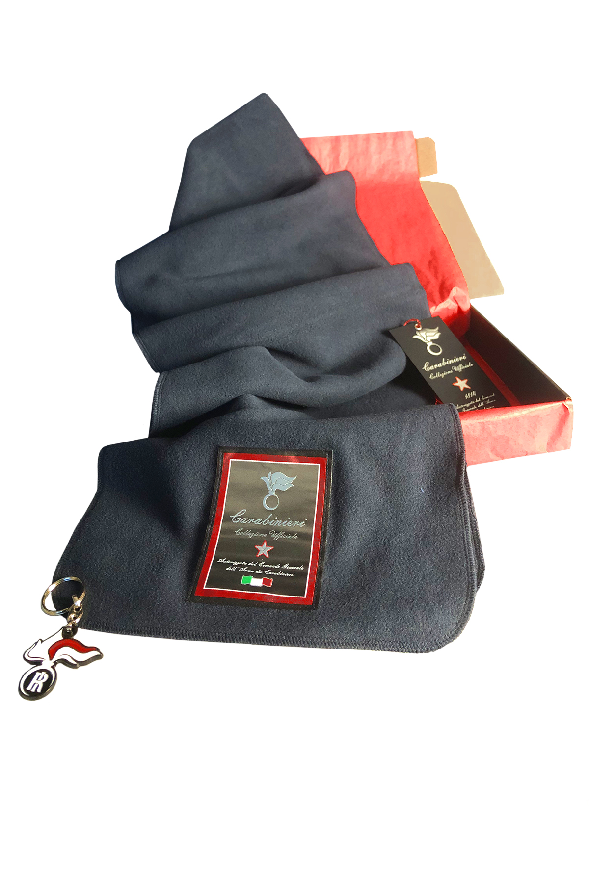 Idea regalo Carabinieri Collezione Ufficiale: SCIARPA in PILE blu 100%PL 180X30 CM E PORTACHIAVI FIAMMA IN METALLO SMALTATO SILVER. CONFEZIONE REGALO IN SCATOLA NERA CON FIOCCO ROSSO.