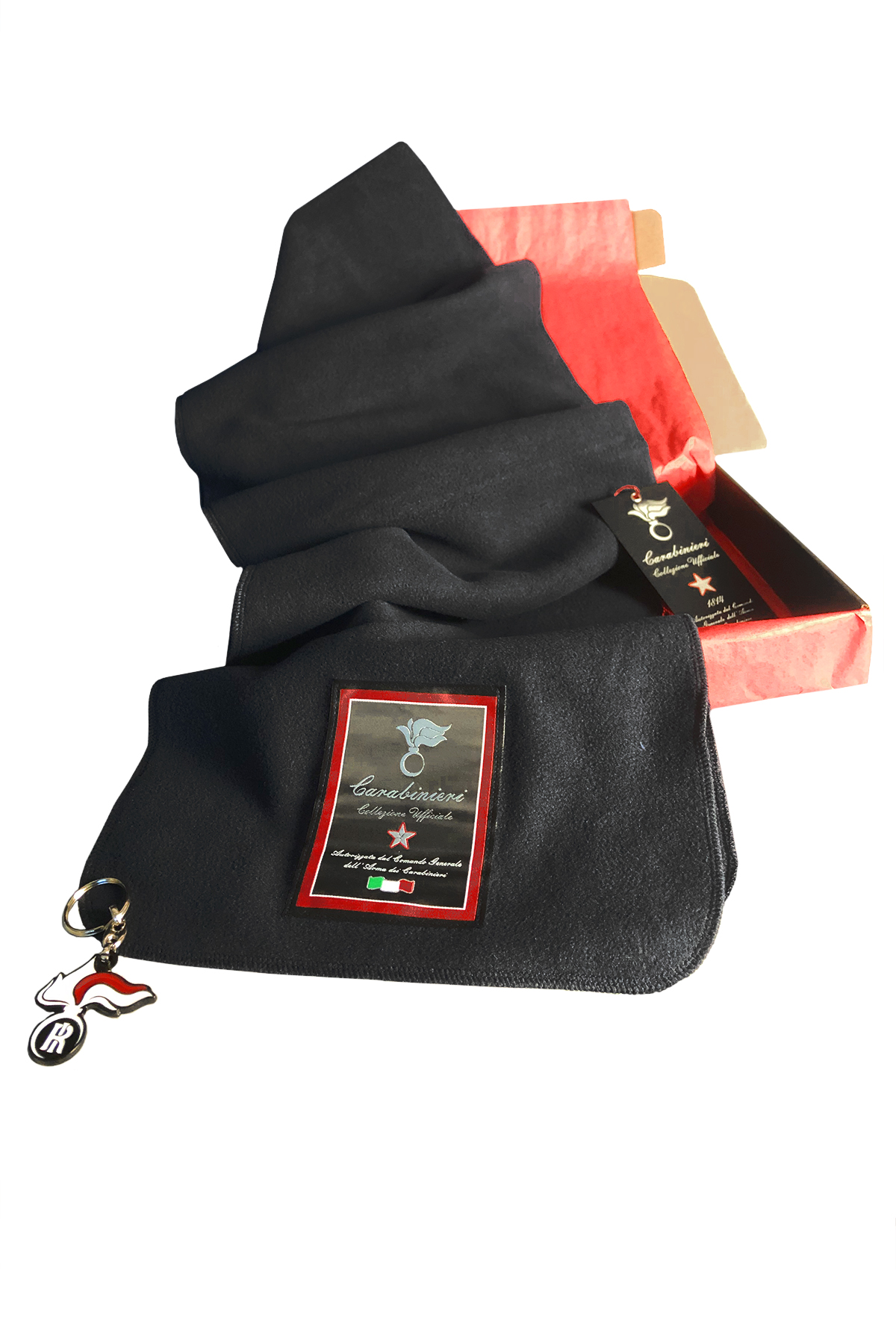 Idea regalo Carabinieri Collezione Ufficiale: SCIARPA in PILE NERO 100%PL 180X30 CM E PORTACHIAVI FIAMMA IN METALLO SMALTATO SILVER. CONFEZIONE REGALO IN SCATOLA NERA CON FIOCCO ROSSO.