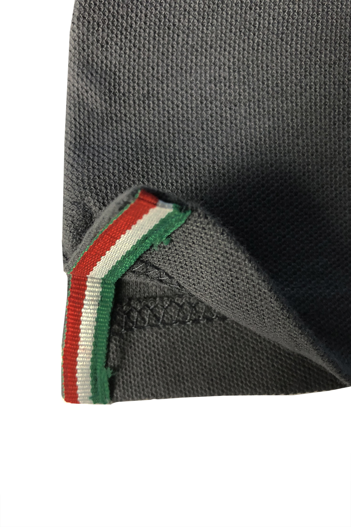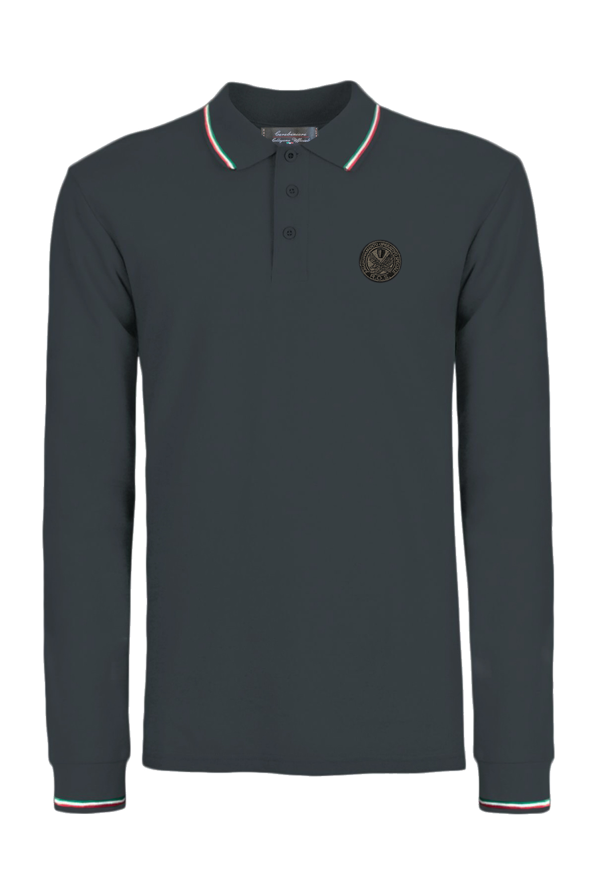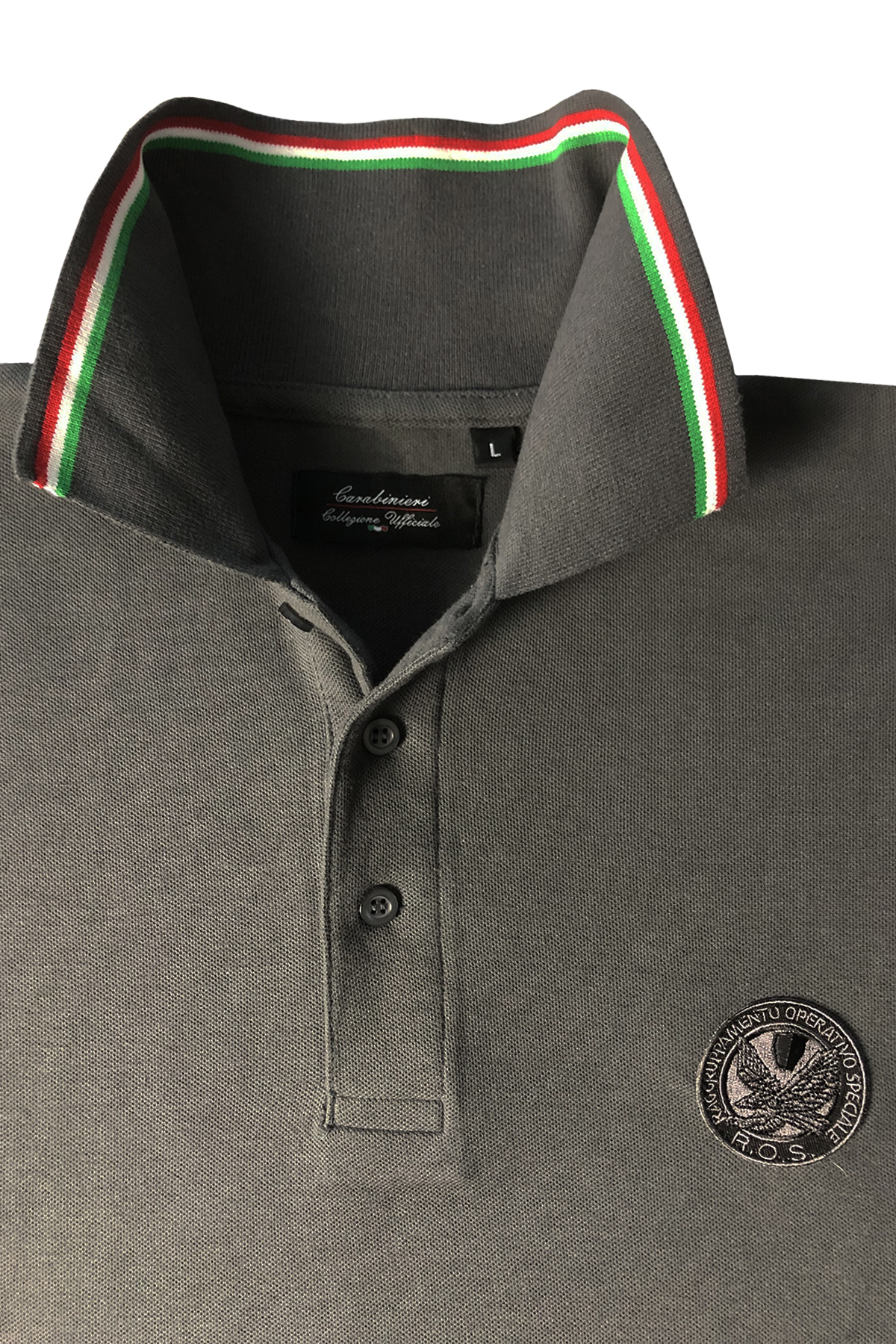Polo a manica lunga GRIGIO firmata Carabinieri Collezione Ufficiale 100% cotone pettinato Ringspun. Colletto e polsini a coste con profili tricolore. Abbottonatura a 3 bottoni tono su tono Fondo dritto con spacchi laterali rinforzati da nastro tricolore. Bottone di ricambio sulla cucitura laterale interna. Patch ricamato a cuore R.O.S. REPARTO OPERATIVO SPECIALE