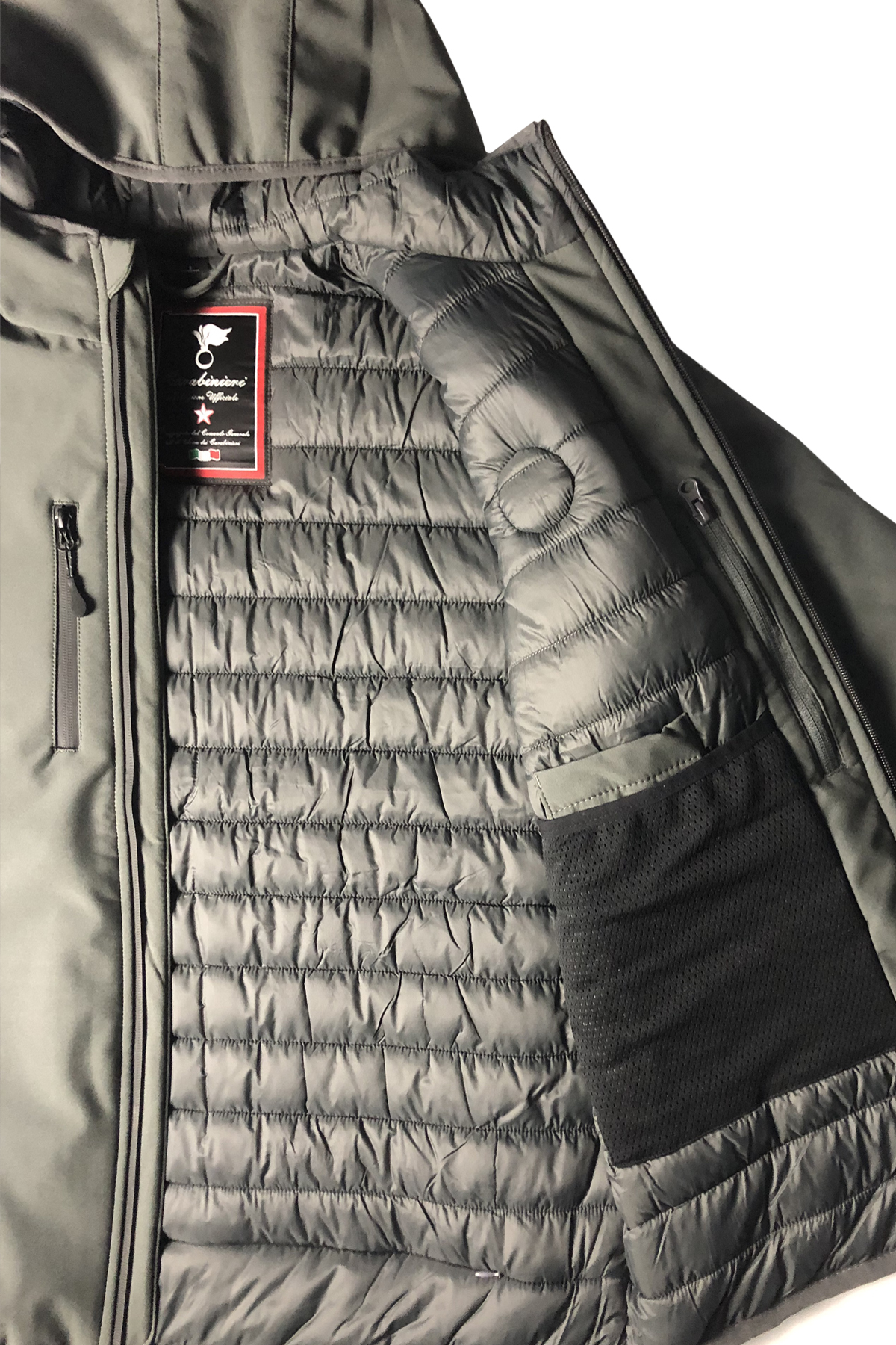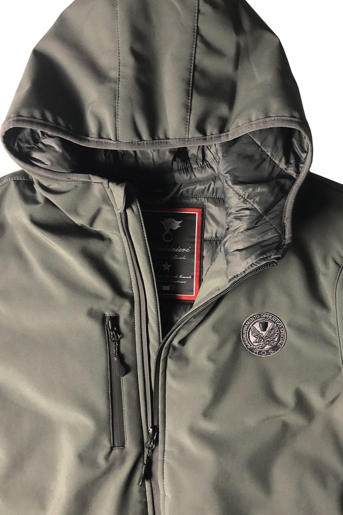 La nuova giacca IMBOTTITA GRIGIO ASFALTO firmata Carabinieri Collezione Ufficiale in soft shell. Tessuto esterno impermeabile e traspirante 6% elastan 3 strati - Membrana 5000 mm, imbottitura 94% poliestere riciclato, fodera: 100% poliestere. Fullzip - 2 tasche laterali e 1 tasca sul petto con zip. Giromanica e fondo bordati con sbieco elasticizzato. Patch ricamato a cuore ROS RAGGRUPPAMENTO OPERATIVO SPECIALE.