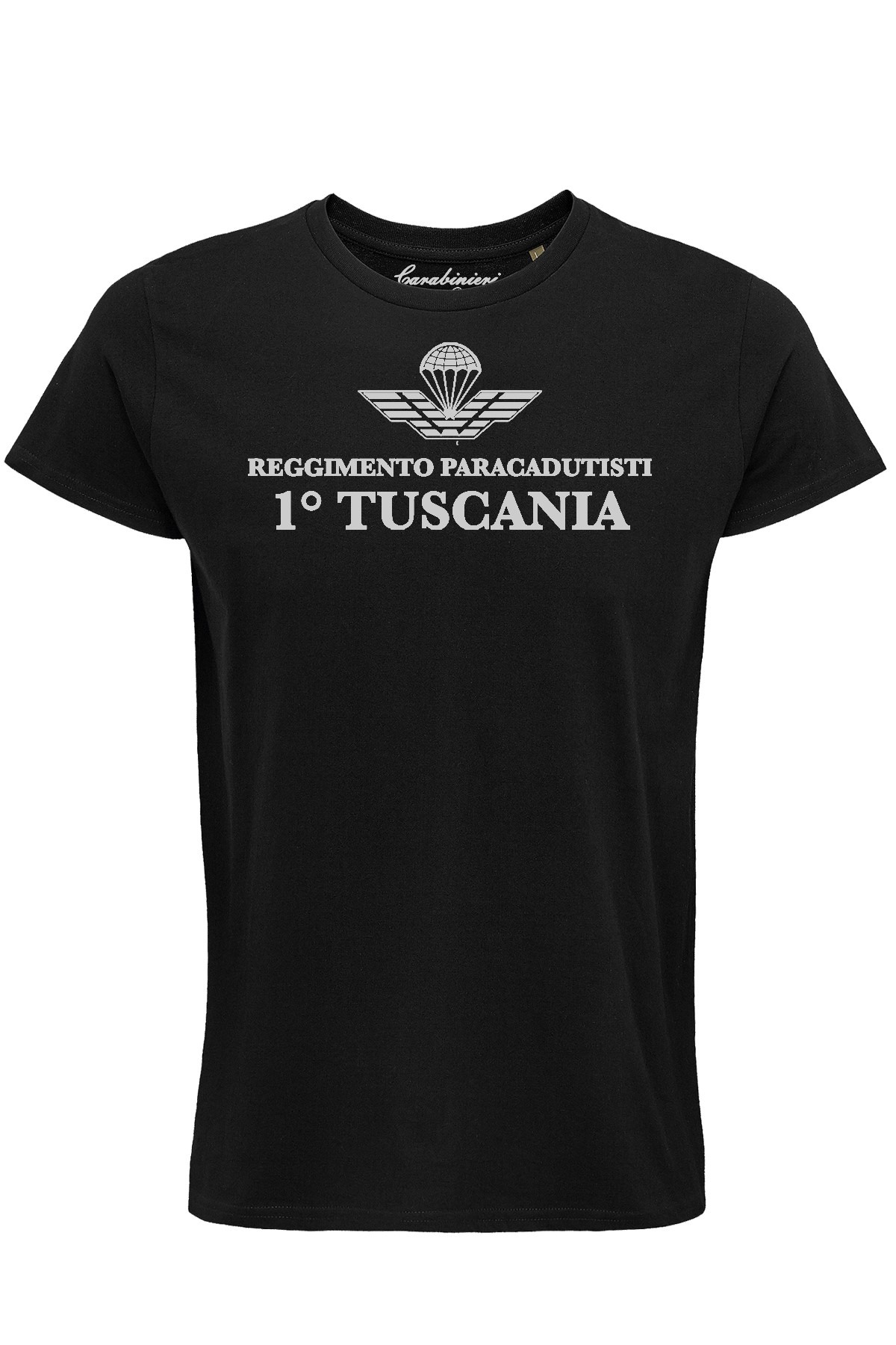 Una semplice nera firmata Carabinieri Collezione Ufficiale diventa unica grazie alla stampa monocolore del Primo Reggimento Paracadutisti Tuscania. 100% cotone organico.