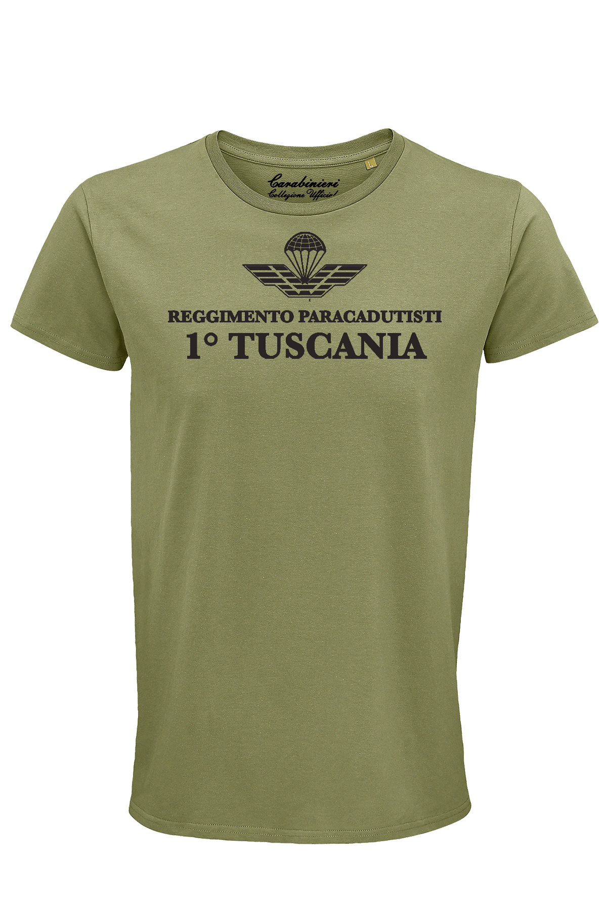 Una semplice t-shirt verde militare firmata Carabinieri Collezione Ufficiale diventa unica grazie alla stampa monocolore del Primo Reggimento Paracadutisti Tuscania. 100% cotone organico.