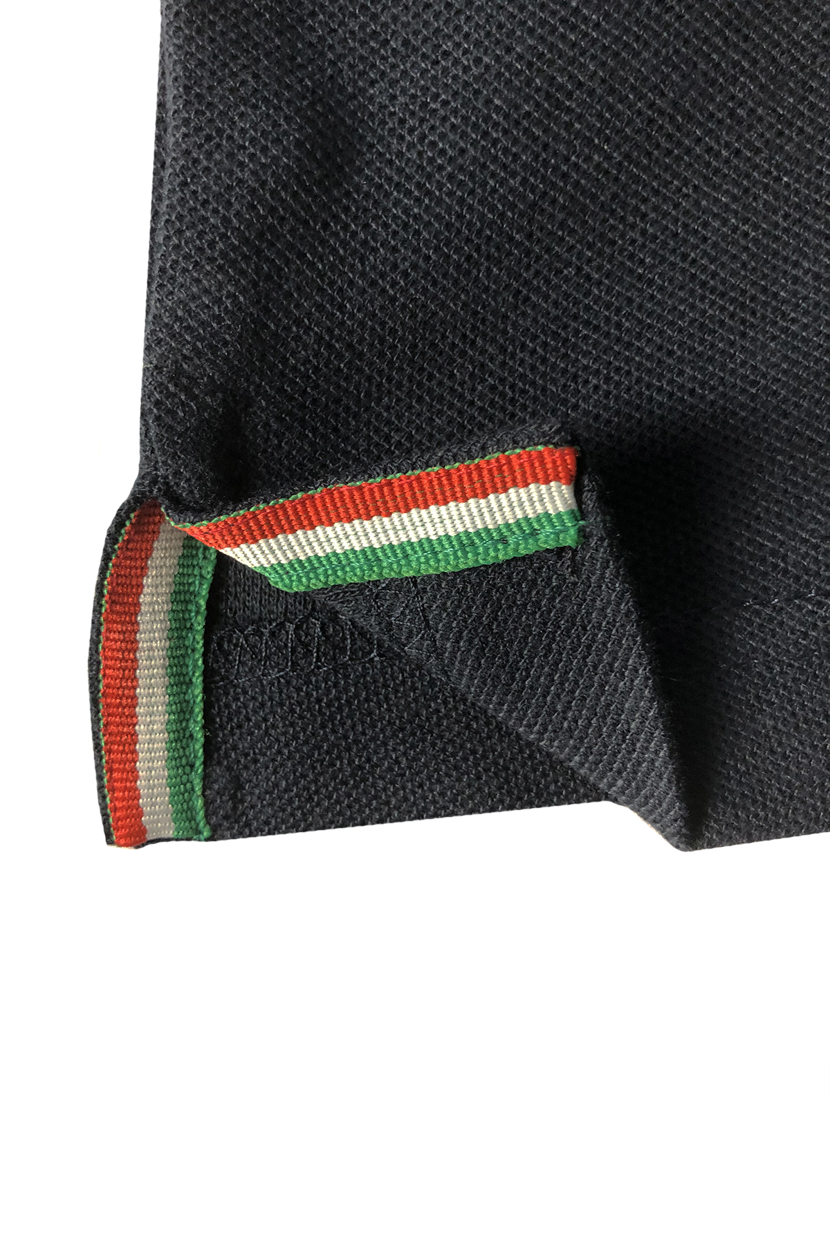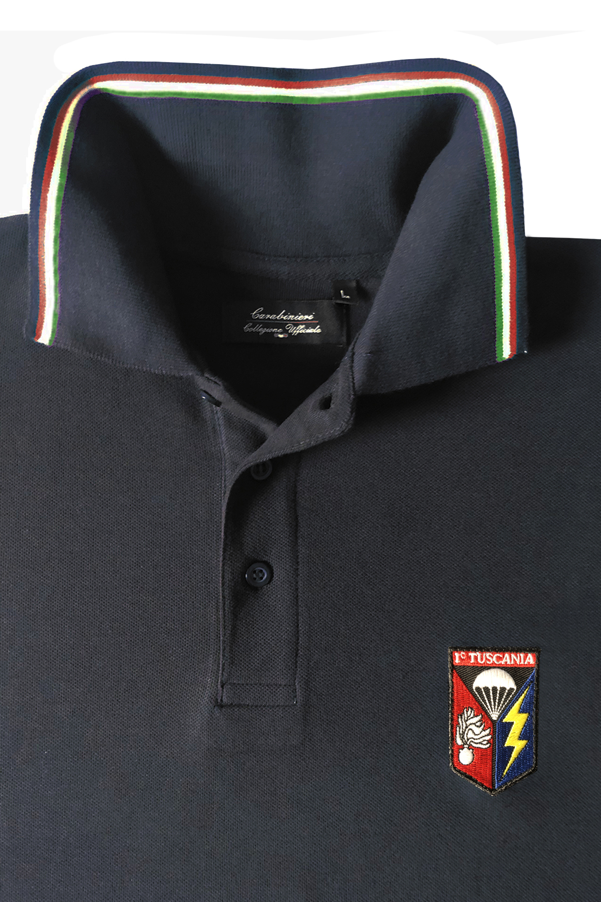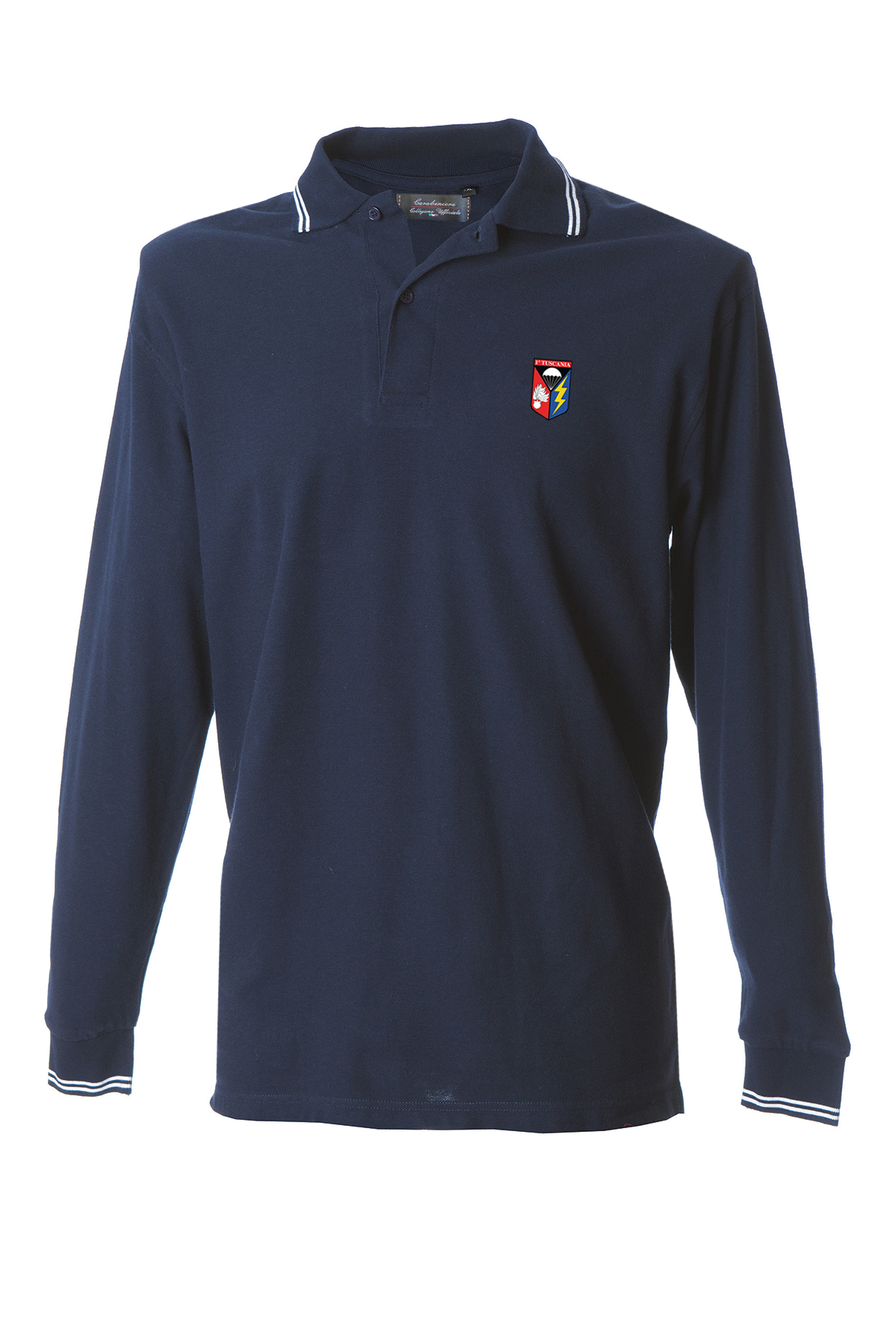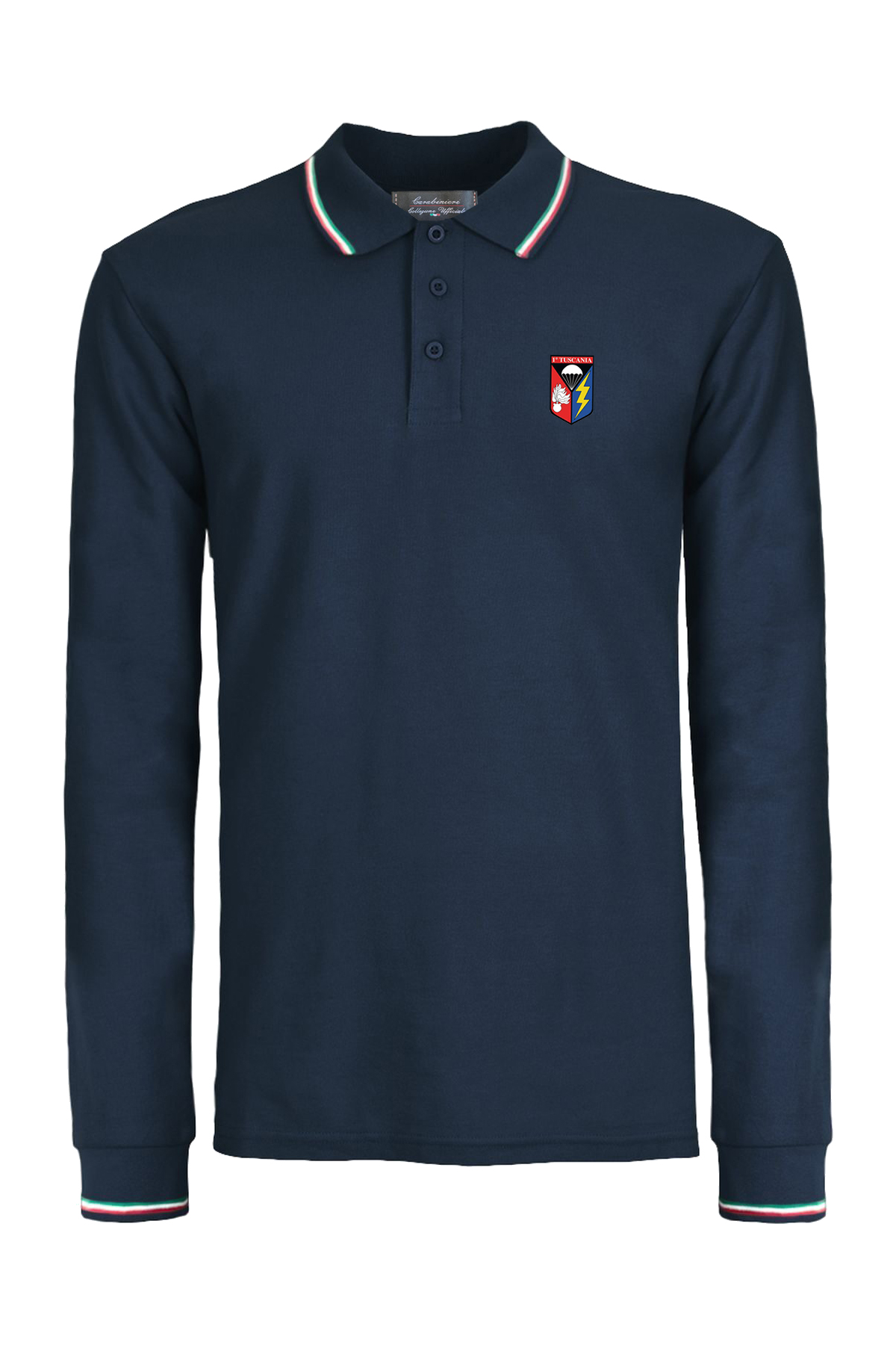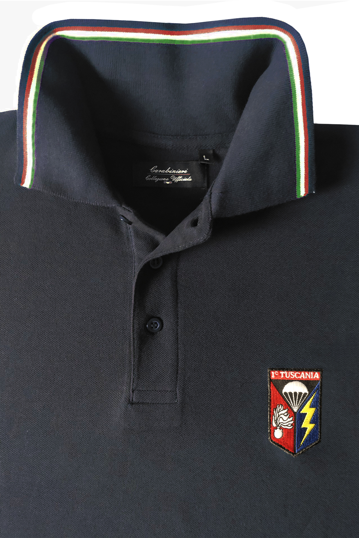 Polo a manica lunga blu firmata Carabinieri Collezione Ufficiale 100% cotone pettinato Ringspun. Colletto e polsini a coste con profili tricolore. Abbottonatura a 3 bottoni tono su tono Fondo dritto con spacchi laterali rinforzati da nastro tricolore. Bottone di ricambio sulla cucitura laterale interna. Patch ricamato a cuore TUSCANIA.
